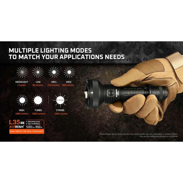 ntroducing the Acebeam L35 2.0 Led Flashlight - 5000 Lumens, Black. A tactical powerhouse that redefines what's possible in a flashlight. With a blinding maximum output of 5000 lumens and an impressive beam distance of 650 meters, this flashlight stands in a league of its own. The upgraded CREE XHP70.3 LED ensures a brilliant and far-reaching beam, making it an ideal choice for tactical, hunting, duty, law enforcement, search, and outdoor applications.